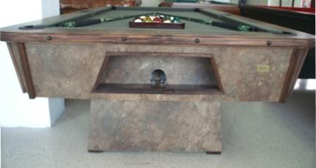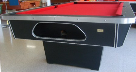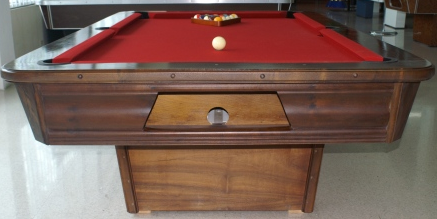 Non-Coin Operated billiard table, made in a wooden finish with either centered rail system or pockets. We stain the wood areas with matching colors. We have more than 20 colors of laminated sheets that may be combined with more tha 25 different table cloth colors.